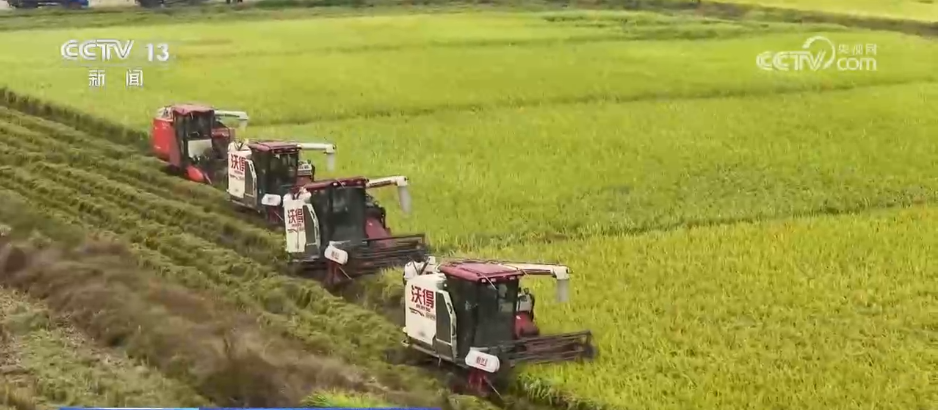 正在江西吉安吉水县水田乡的一处高尺度农田,现正在正值晚稻集中收割的环节期间。正在记者死后,几台收割机正穿越正在稻浪之中。伴跟着机械轰鸣声,切割、脱粒、破坏秸秆等工序趁热打铁。金黄的稻谷顺着输粮管道进入运输车,随后被送往烘干厂。机械化的收割效率很高,一台每天可以或许收割五六十亩,连片的几百亩稻田几台收割机一天就能收完。